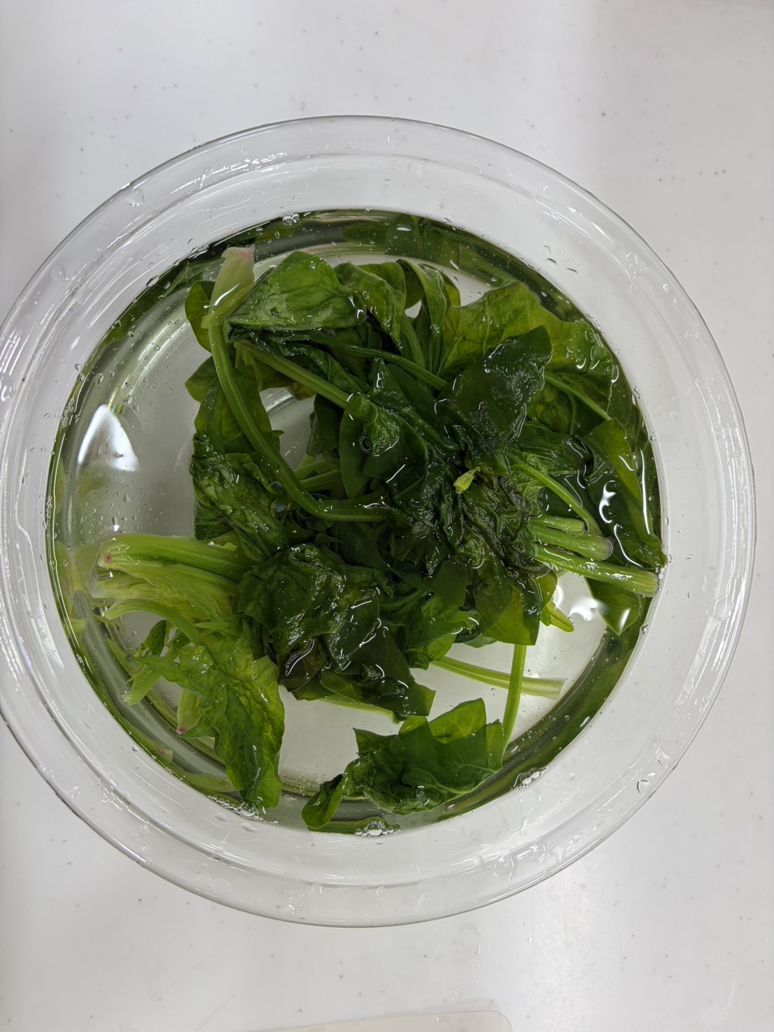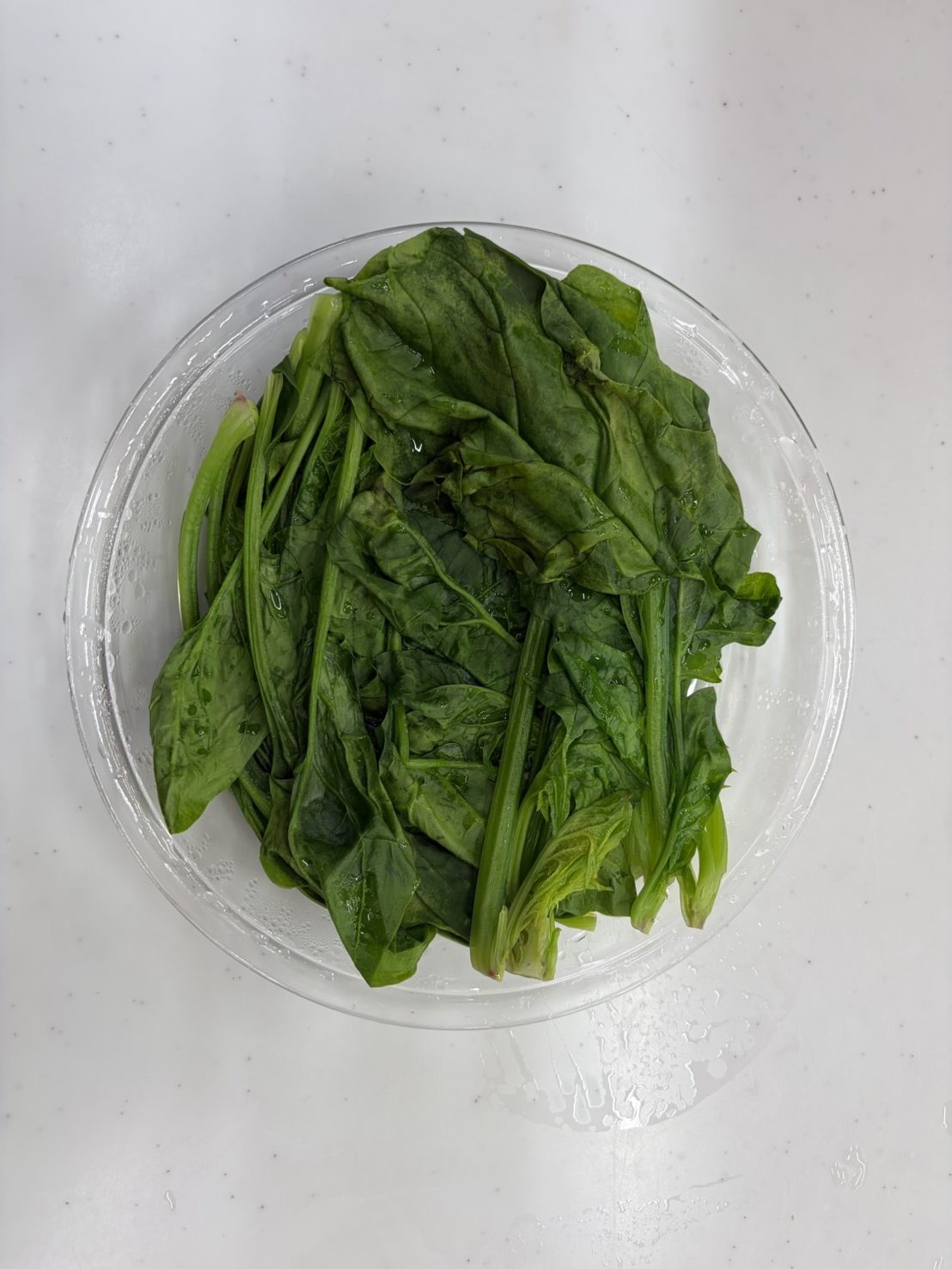 まず、ほうれん草はあらかじめレンジで温め、冷たい水にさらして色止めをしておきます。